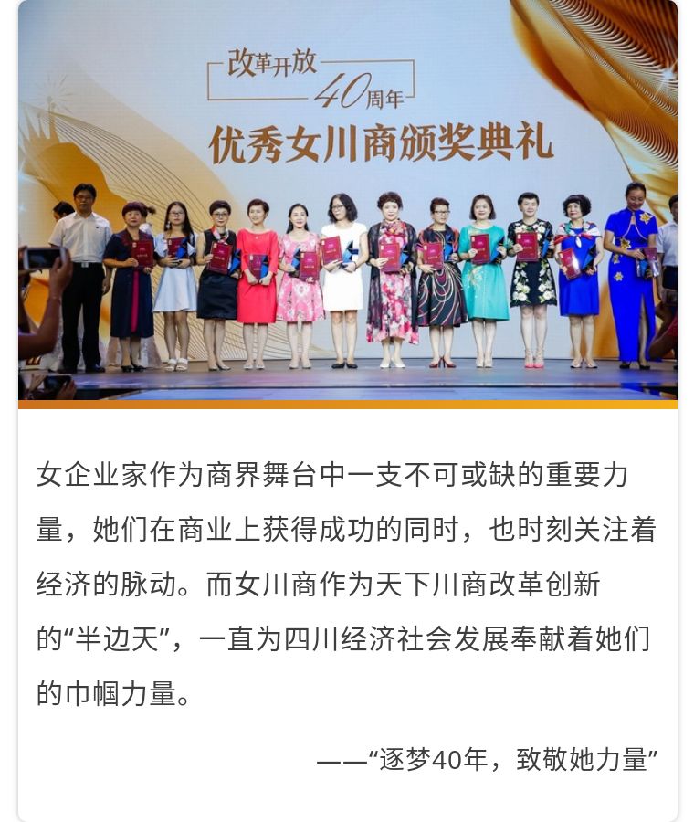盛典同期發布了“改革開放40周年優秀女川商”獲獎名單并舉行了頒獎典禮,集團副總裁范力女士及其他24位女川商榮獲“改革開放40周年優秀女川商”獎項。